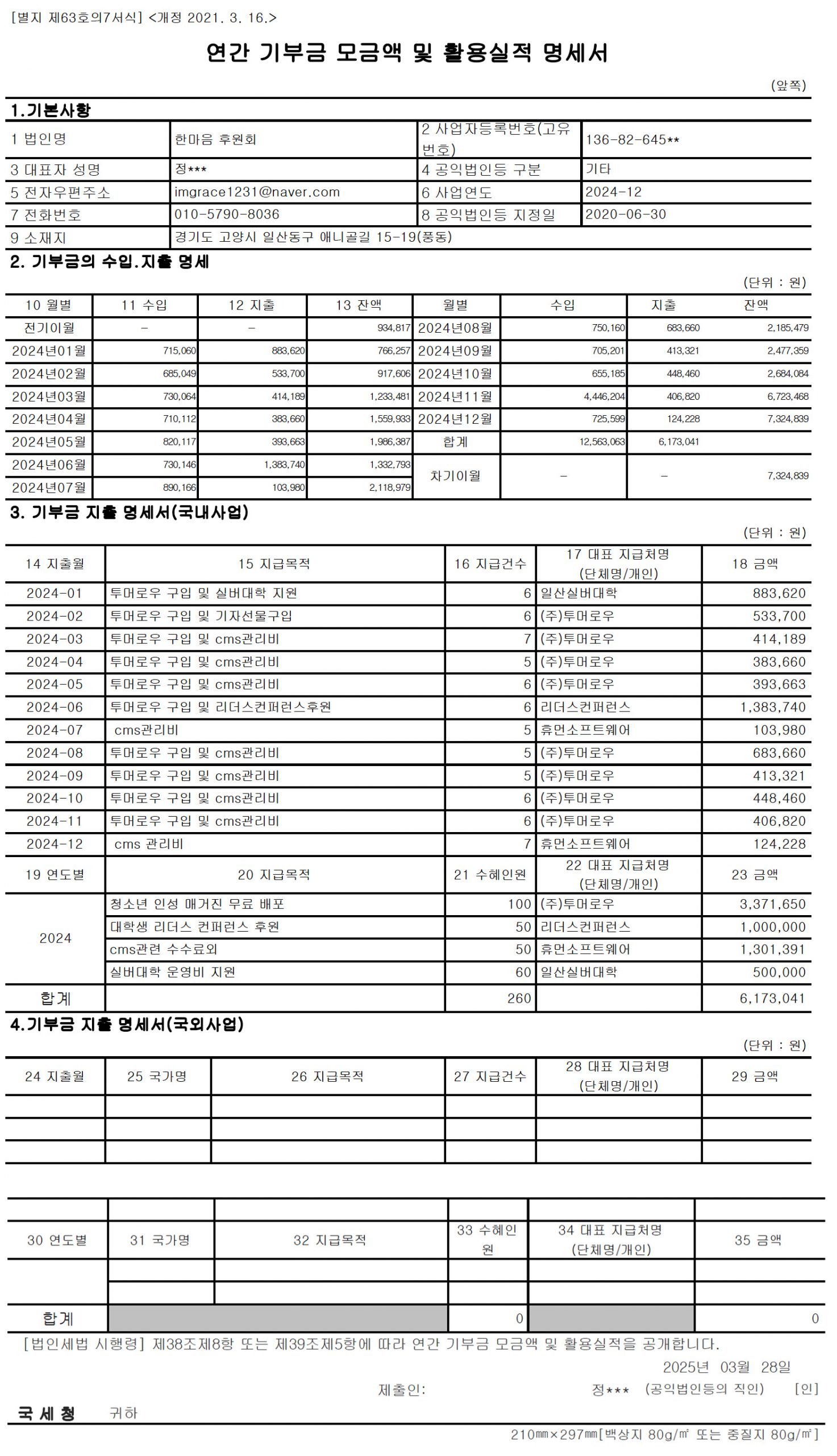 2024 기부금 모금액 및 활용실적 명세서